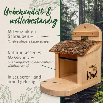 Die hochwertige Futterstelle ist mit Plexiglas ausgestattet, Eichhörnchen erkennen schnell das Futter und können sich durch den aufklappbaren Deckel in Rindenoptik bedienen. So lädt das Futterhaus zum Beobachten der kleinen Nager bei der Futterbeschaffung ein.