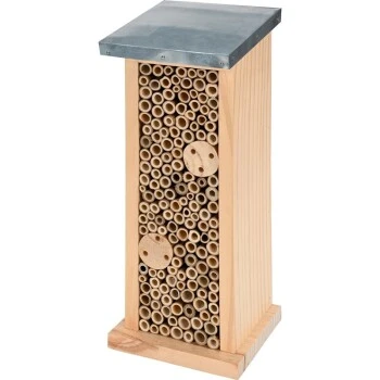 Die mit Bambusrohren gefüllte Nisthilfe wird aus Hartholz hergestellt und unterstützt damit die Wildbienen und andere Insekten, die einen wichtigen Beitrag zur Bestäubung leisten. Die glatten Kanten erhöhen die Chancen einer Ansiedlung und das Metalldach schützt vor Witterungseinflüssen. Das Insektenhotel sollte an einem sonnigen, vor Wind und Regen geschützten Ort aufgehängt werden. Optimal ist eine Ausrichtung in Richtung Süden und eine Höhe von mindestens 50cm. Das Insektenhotel sollte ganzjährig draußen im Freien gelassen werden.