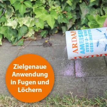 Streuverfahren: 10 g/m2 (entspricht ca. 2 gestrichenen Teelöffeln) gleichmäßig auf die Laufwege (Ameisenstraßen) und in festgestellte Nester streuen. Gießverfahren: Pro Ameisennest 10 g in 0,5 l Wasser auflösen, gut umrühren und in die Ameisenstraßen und Fugen in Plattenwegen hineingießen. Die Nester am besten morgens oder abends behandeln, da sich dann fast alle Ameisen im Bau aufhalten. Das Gießverfahren schont Nützlinge und andere Insekten.