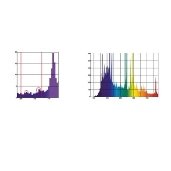 - Das Spektrum verändert sich mit zunehmender Lebensdauer der Lampe. Dieser Effekt ist auch stark abhängig vom verwendeten Vorschaltgerät. Elektronische Vorschaltgeräte bringen im Allgemeinen eine konstantere Leistung als elektromagnetische Betriebsgeräte
