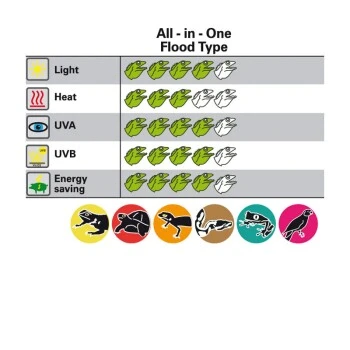 Die Bright Sun FLOOD wurde als Alternative zu HQI-Strahlern für die großflächige Ausleuchtung des Terrariums entwickelt. Der Vorteil der Lampen liegt in der vorhandenen UVA- und UVB- Strahlung. Durch den 60°-Reflektor wird das Licht weitflächig gestreut. Für die optimale Ausleuchtung des Terrariums empfiehlt sich die Kombination mit einer Bright Sun UV Desert für die Schaffung lokaler Sonnenpunkte. Für Tiere mit geringeren UV-Bedürfnissen, wie z.B. Geckos, ist die Bright Sun FLOOD Desert auch als Alleinbeleuchtung geeignet. Der Mindestabstand zum Tier sollte 20 cm nicht unterschreiten.