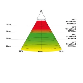Die Bright Sun ULTRA Desert ist eine Hochleistungslampe, die sich ausschließlich für große Terrarien eignet. Es muss unbedingt ein Mindestabstand von 40 cm zum Tier eingehalten werden. Bei diesem Abstand werden schon Temperaturen über 50°C erreicht! Dank einer speziellen Reflektorkonstruktion wird in der Mitte ein Teil des Licht stark gebündelt, um eine gute UV- und Wärmeleistung zu erzielen. Das restliche Licht wird aber weitflächig gestreut und erzielt so eine gute Ausleuchtung des Terrariums. Die Bright Sun ULTRA Desert ist damit eine einzigartige Zwitterlampe, die perfekt zu den Anforderungen bei großen Terrarien passt.