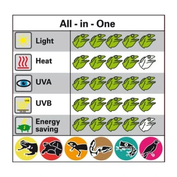 Versuche von Lucky Reptile zeigten, dass ein Tageslichtspektrum mit einer Farbtemperatur von ca. 6000K von Wüstenreptilien bevorzugt wird. Entsprechend wurde dies bei der Entwicklung der Bright Sun UV Desert berücksichtigt. Das hellweiße Licht wird von den Tieren sehr gerne angenommen, und die Lampe bietet alles was Wüstenreptilien brauchen. Wärme, UV-Strahlung und Lichtintensität wurden so abgestimmt, dass für die unterschiedlichen Terrarientypen optimale Ergebnisse durch die jeweils passende Wattage erzielt werden. Welches Modell für welche Terrarien geeignet ist, kann den Abstandsgrafiken entnommen werden.