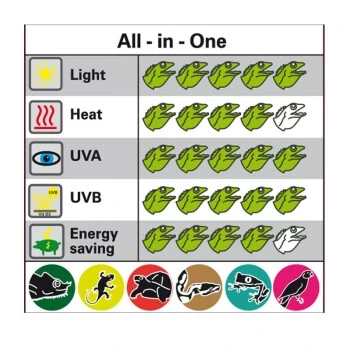 Die Bright Sun UV Jungle wurde speziell für tropische Arten entwickelt. Sie hat eine etwas geringere UV-Leistung als die Bright Sun UV Desert, um den Bedingungen im natürlichen Habitat und der Lebensweise der Tiere Tribut zu zollen. Die Blätter und Zweige im Regenwald filtern einiges an UV-Licht, so dass die Tiere nicht die volle Intensität der Sonne zu spüren bekommen. Zusätzlich muss man beachten, dass baumbewohnende Tiere im Terrarium oft die Möglichkeit haben, sehr nahe an die Lampen heranzukommen. Da UV-Strahlung generell ein Gefahrpotential hat und die UV-Intensität bei 10 cm Abstand 5mal so hoch wie bei 30 cm Abstand ist, wurde bewusst der UV-Anteil reduziert. Das Spektrum wurde an die natürlichen Bedingungen in Waldregionen angepasst. Die Farbtemperatur beträgt 4000K und ist damit deutlich wärmer als das Tageslicht der Bright Sun UV Desert. Tests haben gezeigt, dass tropische Echsen wie Wasseragamen unabhängig vom UV-Anteil das wärmere Licht der Bright Sun UV Jungle dem Tageslicht der Bright Sun UV Desert vorziehen. Außerdem werden die grünen Farben von Pflanzen durch das wärmere Licht besser hervorgebracht, so dass im Terrarium ein richtiges Waldambiente entsteht.