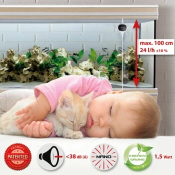 Sie verspricht eine lange Lebensdauer durch hochwertig verbaute Einzelteile, die dadurch auch eine hohe Energieeffizienz aufweisen. Die Leistung der Zweikanal Pumpe beläuft sich auf enorme 2×13 l/h in Bezug auf diese kleine Pumpe. Durch den Saugnapf auf der hinteren Seite der Pumpe lässt sie sich beliebig an glatten Flächen anbringen.