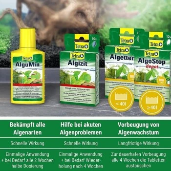 Tetra AlguMin sollte bei beginnenden Algenproblemen anwgewendet werden. Es enthält ein breites Wirkungsspektrum gegen alle häufig auftretenden Algenarten.
