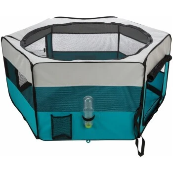 Der Kleintier- und Welpenauslauf aus strapazierfähigem Polyester ist ideal für die Benutzung im Garten und im Haus geeignet. Er dient als Gehege, schützt aber auch Kabel, Teppiche, Möbel usw. vor dem natürlichen Nagetrieb. Durch die Gummierung und die Seitenränder der Bodeneinlage wird eine Verunreinung des Fußbodens verhindert – oder ihr Tier im Garten vor Bodennässe geschützt. Das abnehmbare Netz schützt Ihren Liebling vor Angriffen von Katzen und Greifvögeln.